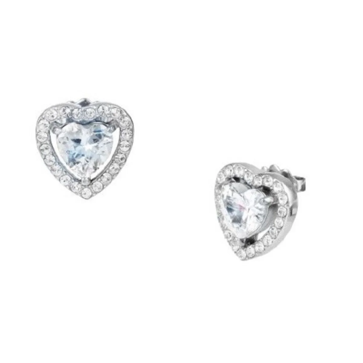 Orecchini della collezione Essential realizzati in acciaio modello a lobo simbolo cuore con cristalli bianchi, lunghezza 1,2 cm, chiusura classica con farfallina.