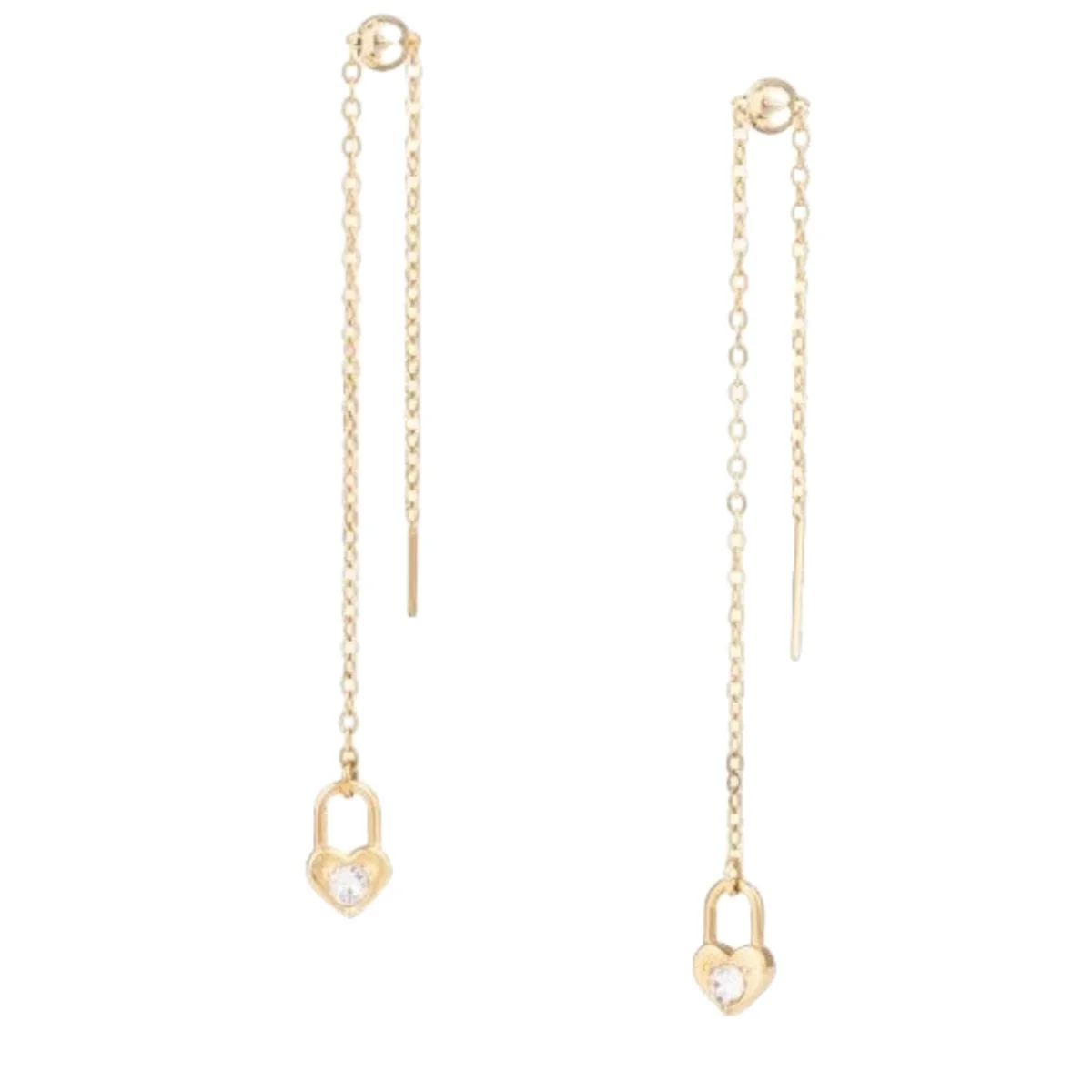 Orecchini della collezione Essential realizzati in acciaio pvd oro giallo con catenina lunga pendente di 11 cm con simbolo cuore a lucchetto con zirconi bianchi.