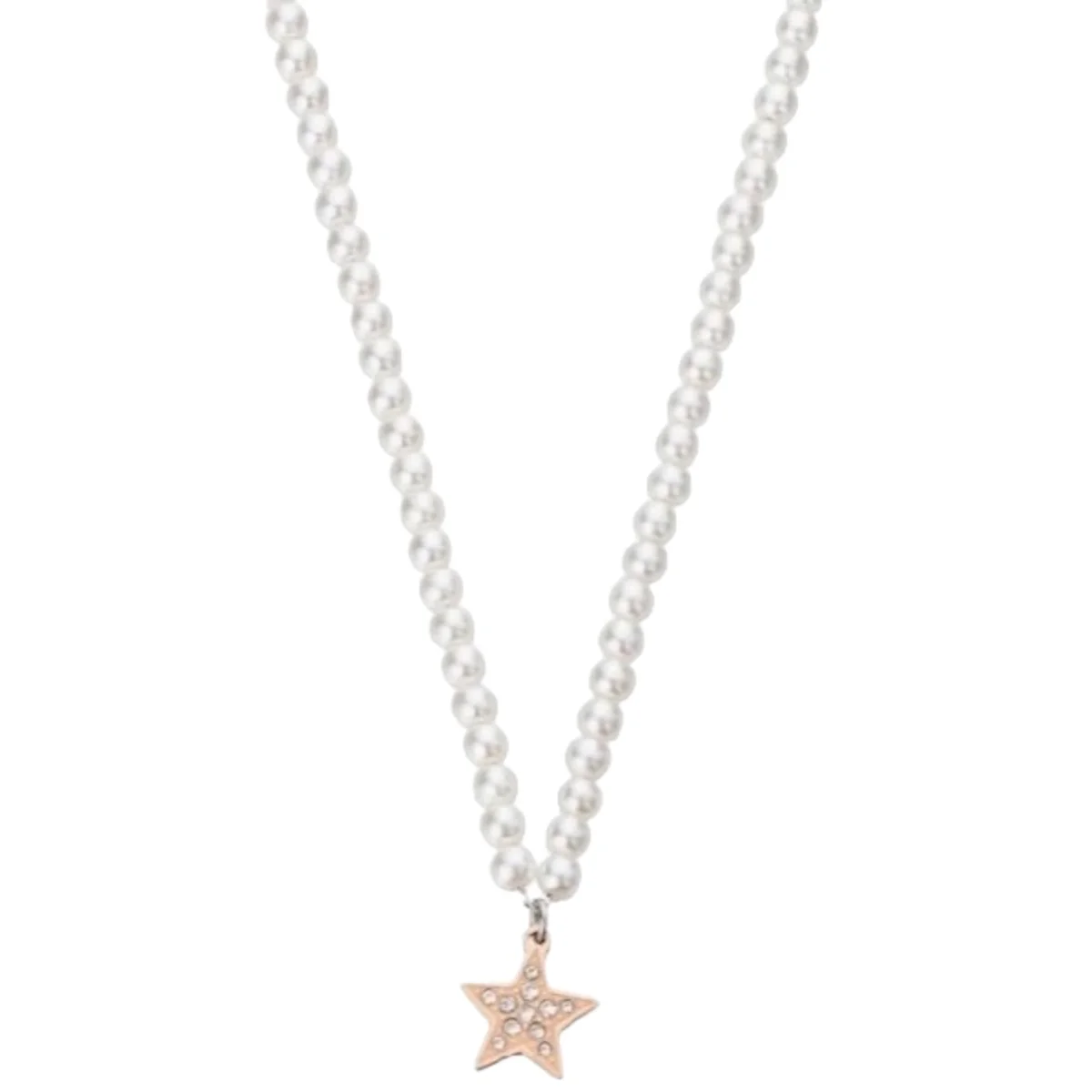 Collana della collezione Essential realizzata in acciaio pvd oro rosa con perle bianche e pendente simbolo stella con zirconi bianchi, lunghezza 40 cm, chiusura con moschettone.