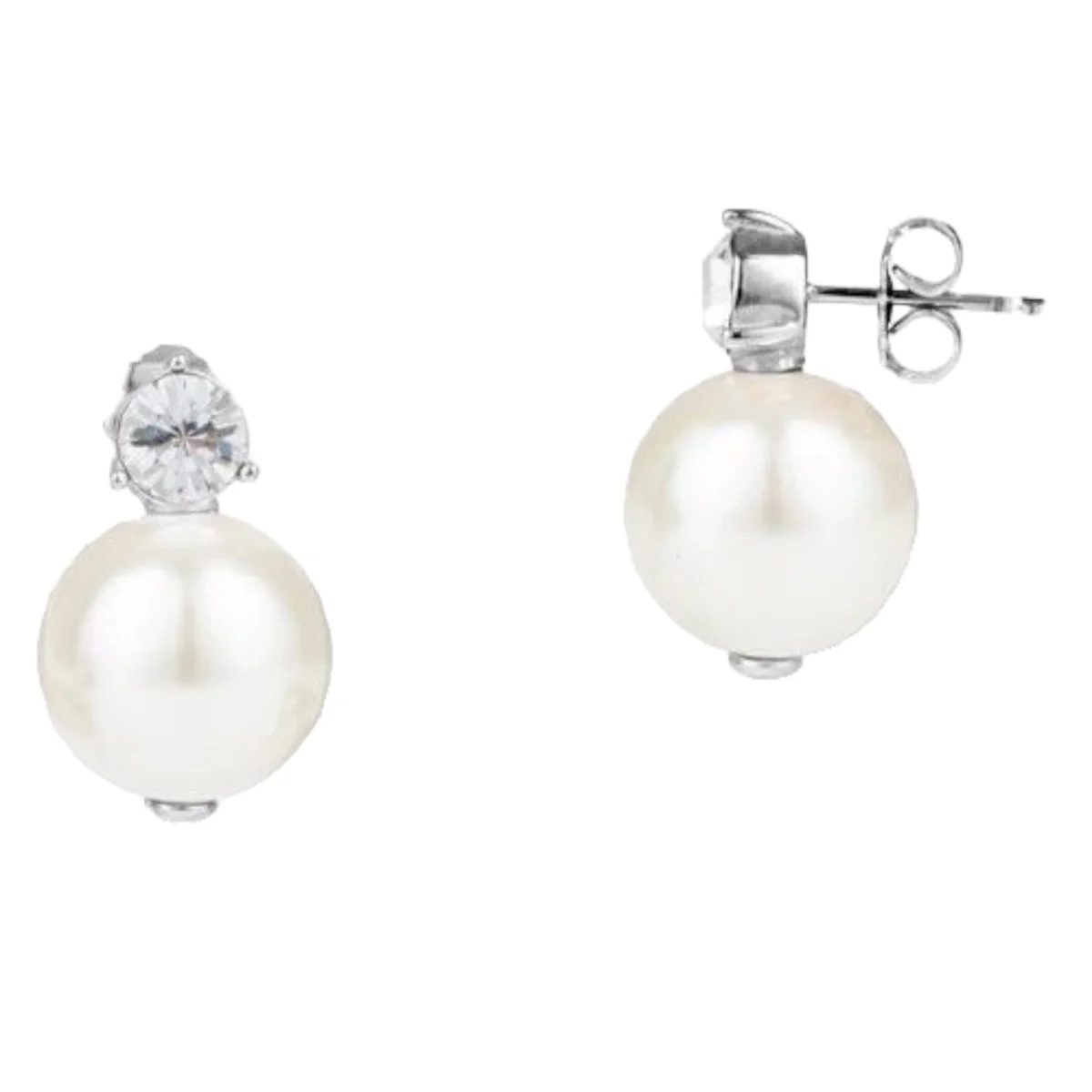 Orecchini della collezione Essential realizzati in acciaio con perla bianca impreziosita da dei cristalli bianchi, modello a lobo lunghezza 1,2 cm, chiusura classica con farfallina.