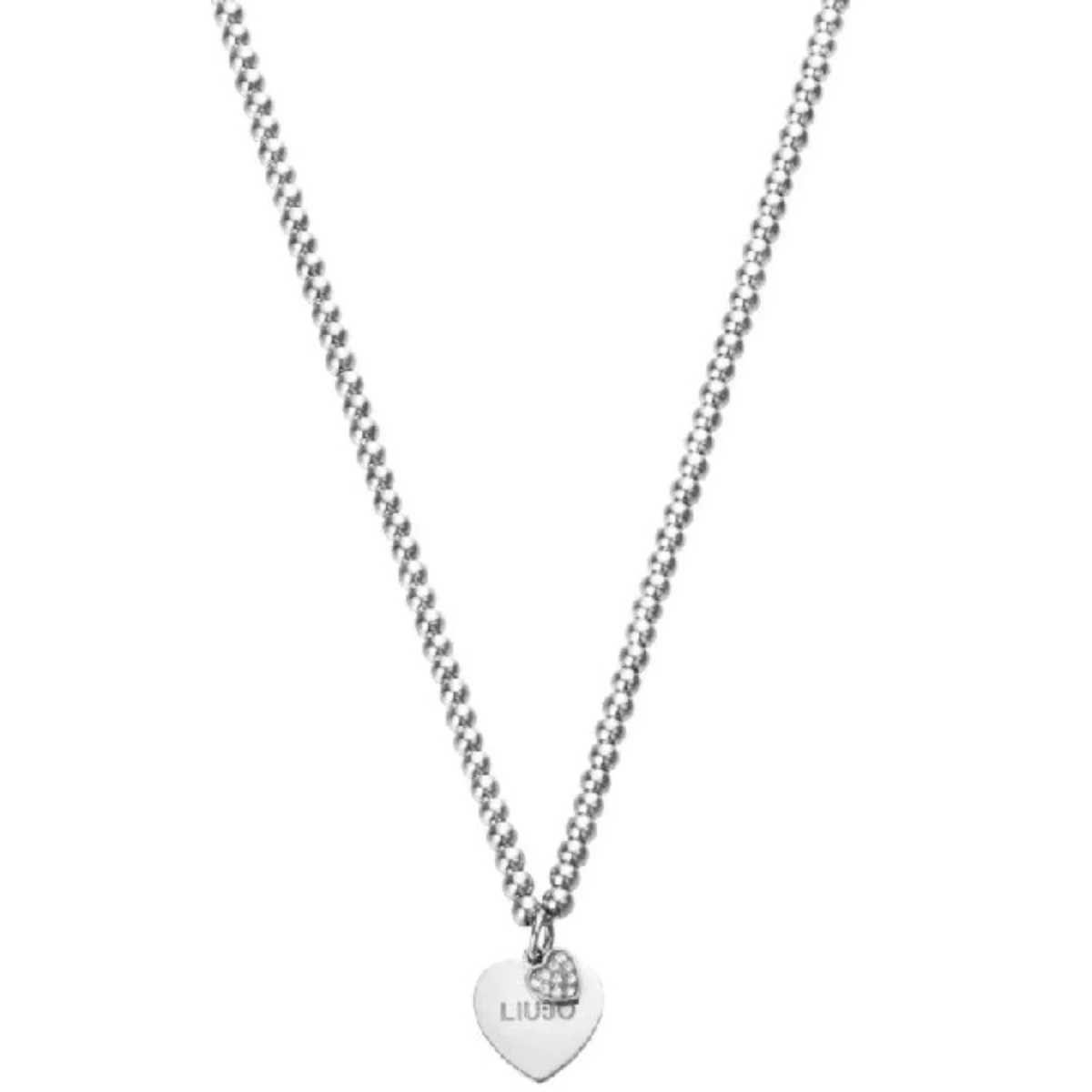 Collana della collezione Essential realizzata in acciaio modello a sfere lucide con pendente simbolo cuore con doppio cuoricino con cristalli bianchi, lunghezza 40 cm, chiusura con moschettone.