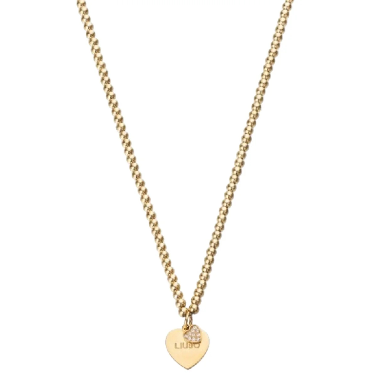 Collana della collezione Essential realizzata in acciaio pvd oro giallo modello a sfere lucide con pendente simbolo cuore con doppio cuoricino con cristalli bianchi, lunghezza 40 cm, chiusura con moschettone.
