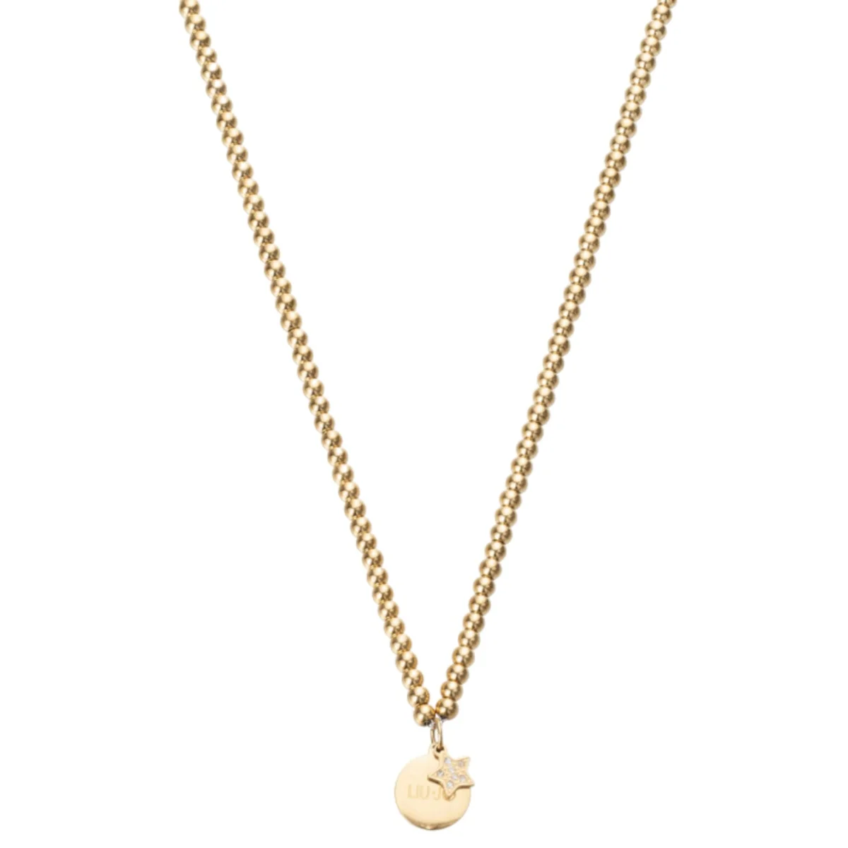 Collana della collezione Essential realizzata in acciaio pvd oro giallo modello a sfere lucide con pendente medaglietta e stellina con cristalli bianchi, lunghezza 40 cm, chiusura con moschettone.