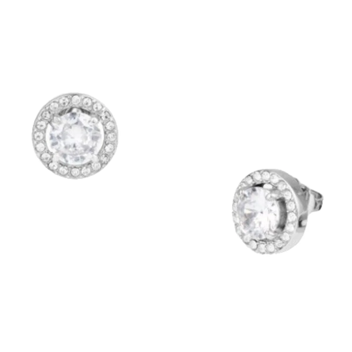 Orecchini della collezione Essential realizzati in acciaio color silver modello a lobo con zirconi bianchi, lunghezza 1 cm, chiusura classica con farfallina