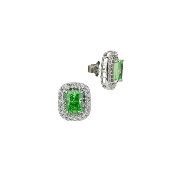 Orecchini in argento rodiati con quadrato di zirconi bianchi, zirconi verde smeraldo e zirconi interni verde smeraldo.