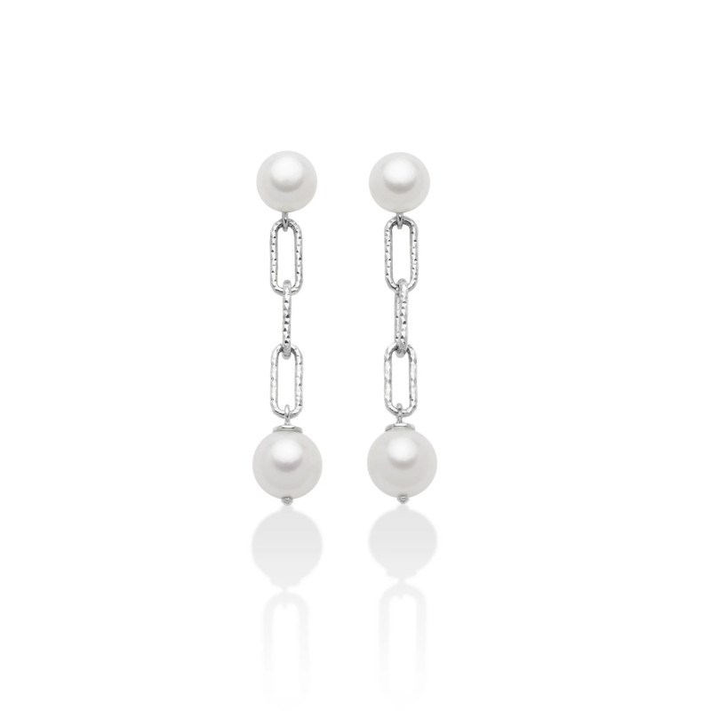 Orecchini in argento 925 con perle coltivate bianche 7, 5/8mm e perle coltivate bianche a bottone 6, 5/7mm con speciale lavorazione diamantata.