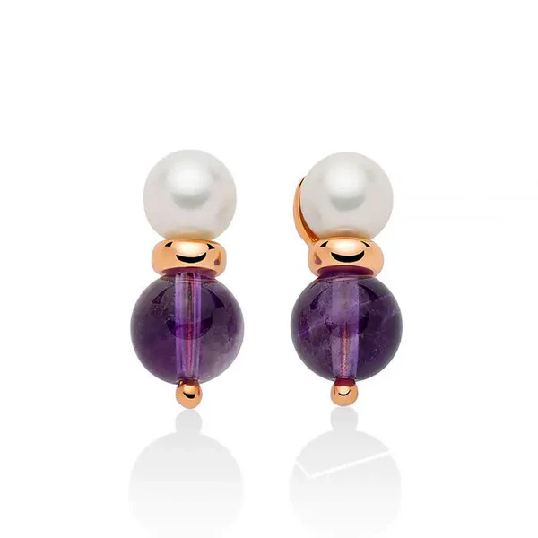 Orecchini in Argento 925 color Oro Rosa , 2 Sfere Ametista da 8 mm e 2 Perle vere R da 6,5-7 mm.