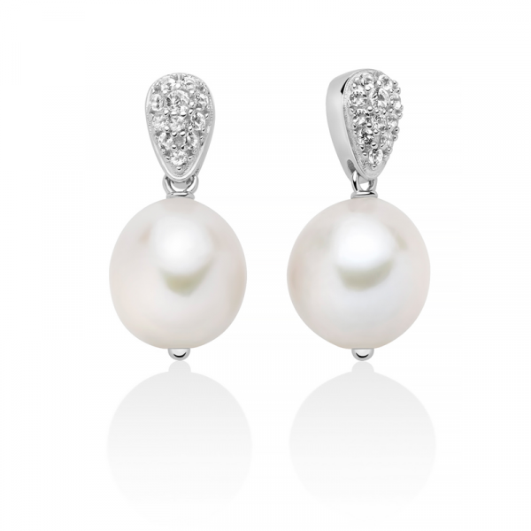 Orecchini realizzati in argento 925, con due perle vere di forma rotonda ed impreziositi da 22 topazi bianchi rotondi.