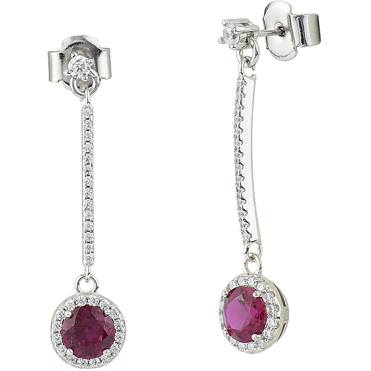 Orecchini in argento rodiati con cristallo pendente di colore rosso e fila lunga di zirconi bianchi.