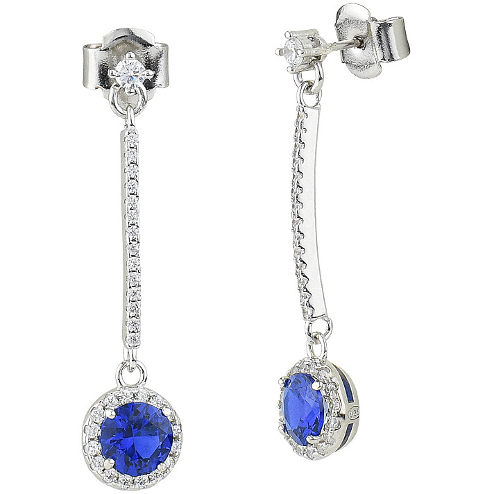 Orecchini in argento rodiati con cristallo pendente di colore blu e fila lunga di zirconi bianchi. Dimensioni: cristallo cm 0,5; lunghezza cm 3. Chiusura: a farfalla.