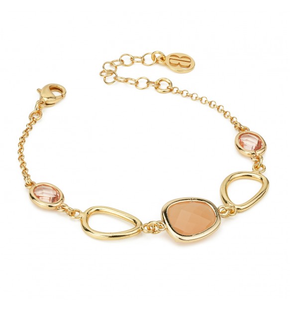 Bracciale in bronzo placcato oro giallo con cristallo centrale arancio, taglio briolette, tra cristalli ovali di colore peach Misura: lunghezza cm 16 estendibile fino a cm 19, 5.